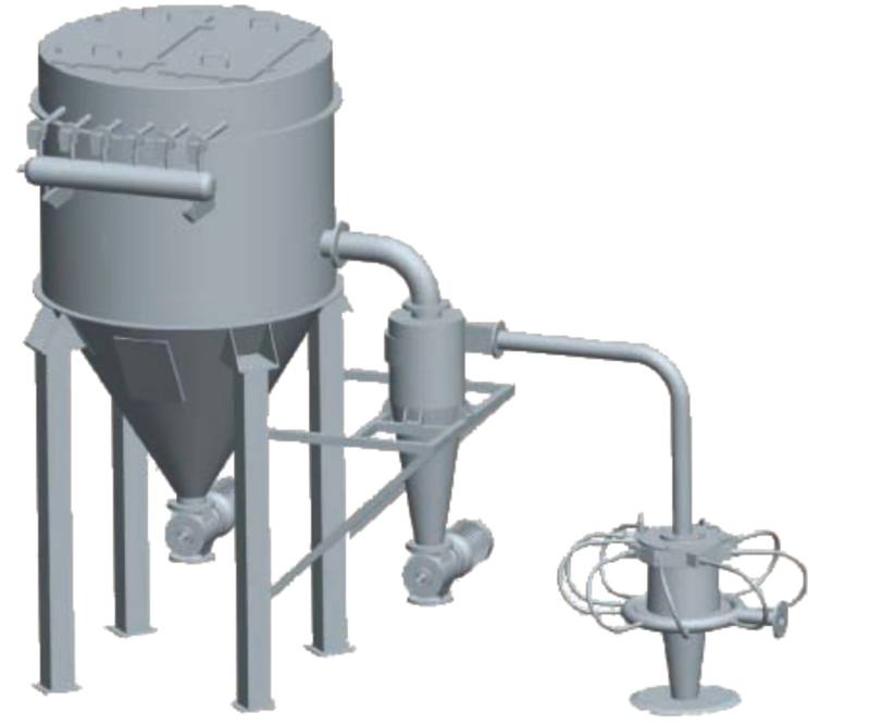 当压缩气体通过加料喷射器,粉碎原料进入粉碎室,在粉碎室外围有数个粉碎喷嘴,喷射超音速气流,使粉料受到气流高速冲击以及粉料互相碰撞、摩擦而粉碎,分级室把较粗的颗粒分离出来,粗颗粒循环返回粉碎室内粉碎在出料口可获得分布均匀的超细粉。